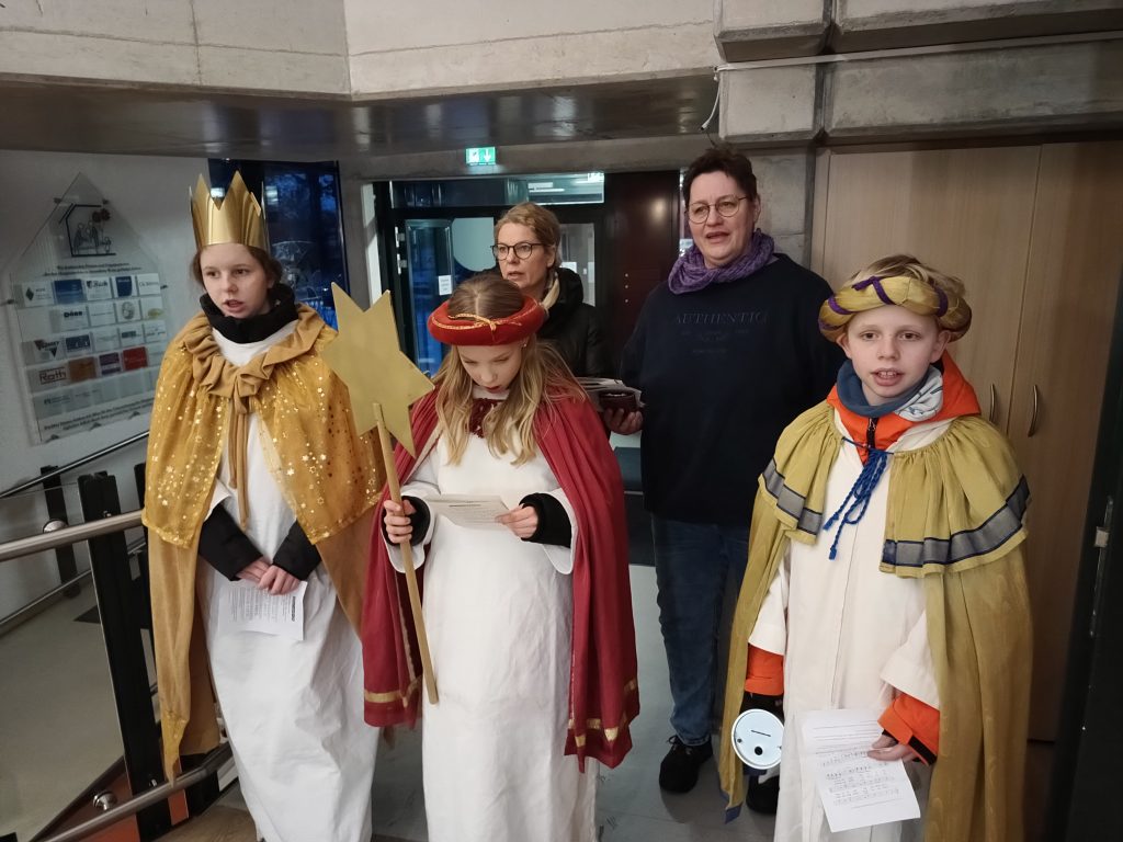 Ein schöne Überraschung erfreute die Gäste unseres Hospizes, als am Sonntag, dem 11. Januar die Sternsinger mit zwei Begleitpersonen zu Besuch kamen. In diesem Jahr steht die bundesweite Sternsinger-Aktion unter dem Motto „Sternsingen gegen Kinderarbeit“. So brachte auch diese Gruppe den Segen Gottes ins Hospiz und machte mit Texten und Liedern auf das diesjährige Anliegen aufmerksam.