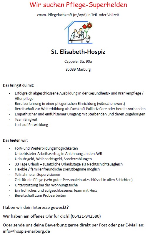 - Samstag, 21.03.2026: Symposion „Wohin führt der Weg? – Neue Perspektiven in der palliativen Versorgung“ von 8 bis 17 Uhr im UniklinikumMarburg. Das Online-Anmeldeverfahren ist inzwischen angelaufen. Näheres dazu und die Möglichkeit, sich anzumelden, finden Sie hier.